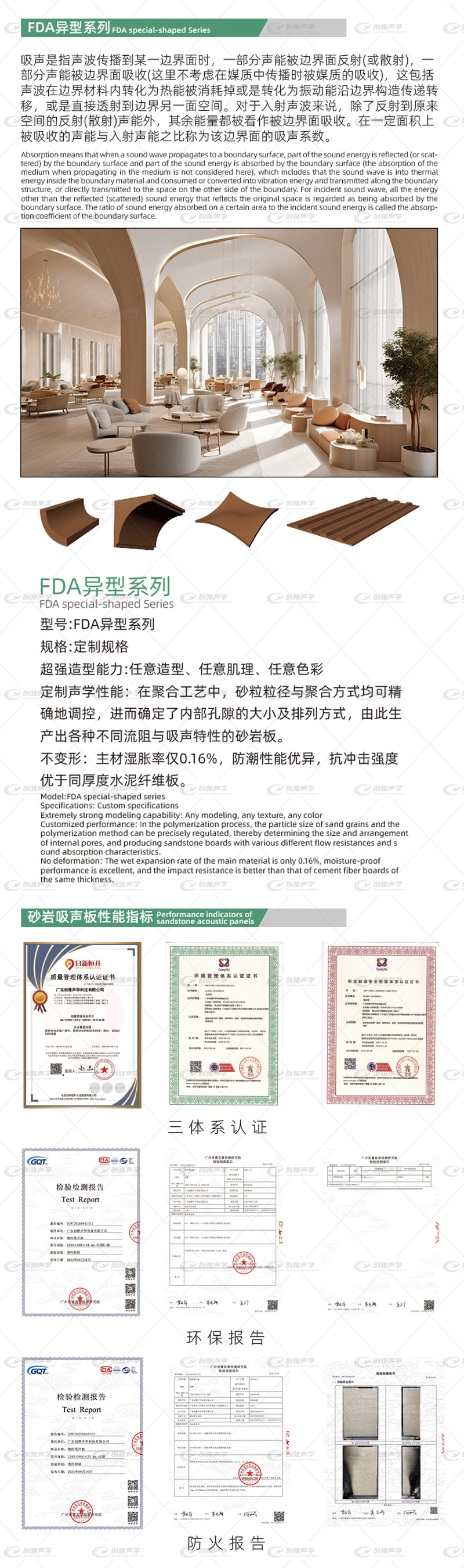 产品介绍:异型砂岩吸声板又名FDA吸音板、陶晶吸声板等,其主要成分是轻质砂粒,具有A级防火,又环保,又防潮的特点,非常适合用在消防要求高,又需要吸声的场所,比如艺术馆,教室,会议室等,材质轻盈,特别适合用于天花板